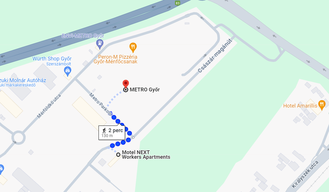 Tesco hypermarket, botika, gas station, Eco Family, Media Markt, tindahan ng mga damit at mga pangdekorasyon sa bahay, at Müller drugstore ay matatagpuan na may layo ng 2 na hintuan ng bus (mga 20-25 minutong lakad). Mayroon din Aldi malapit sa Müller. Para mapuntahan ang mga tindahan na ito, bumaba sa “83-as út, TESCO áruház”! (Para sa iba pang impormasyon para sa pagbiyahe, basahin ang kaugnay na artikulo).